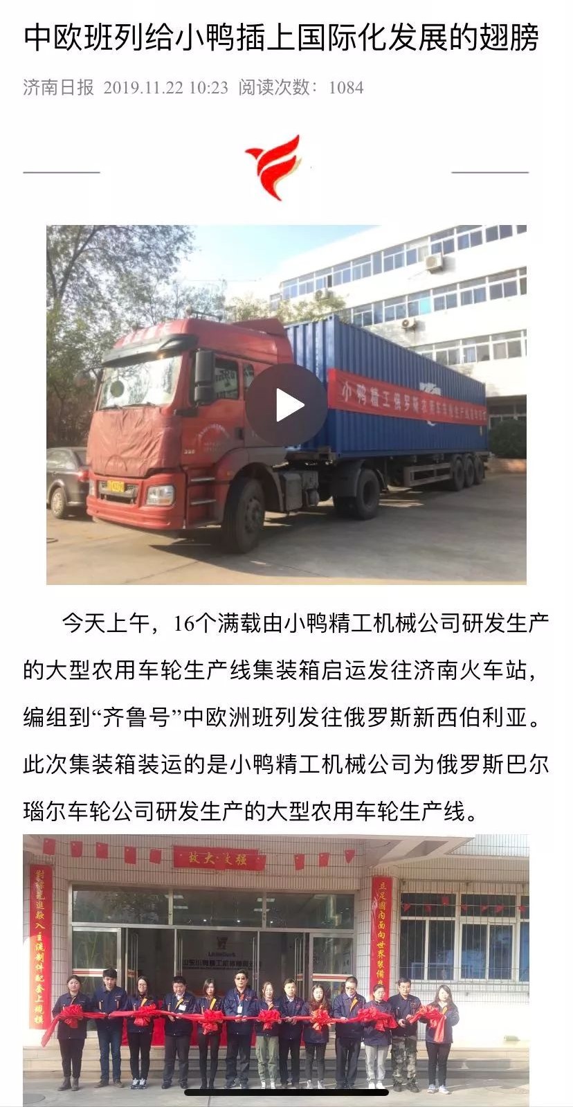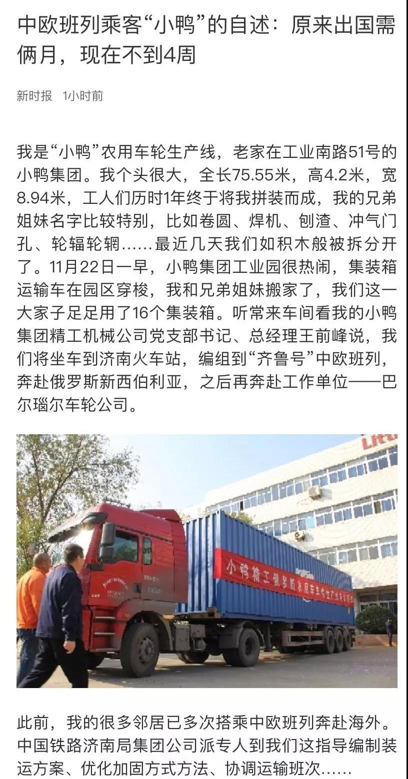 11月22日,小鸭精工俄罗斯农用车车轮生产线发车仪式正式启动,16个集装箱将陆续发到济南火车站,编组到"齐鲁号"中欧班列发往俄罗斯新西伯利亚。