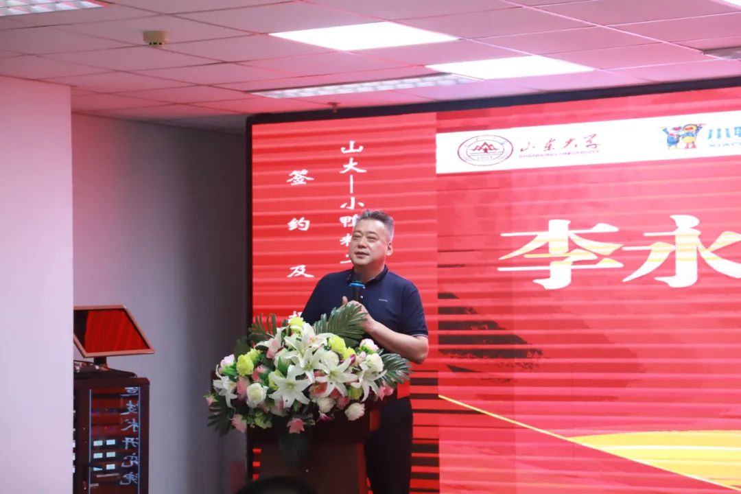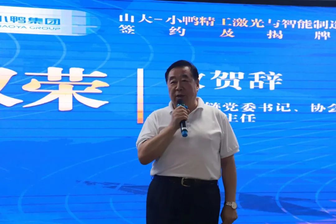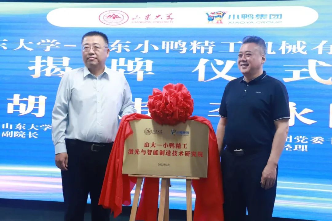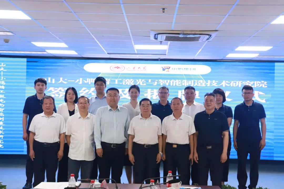 小鸭精工党支部书记、总经理王前峰和山东大学张承瑞教授共同签署山大-小鸭精工激光与智能制造技术研究院共建协议。