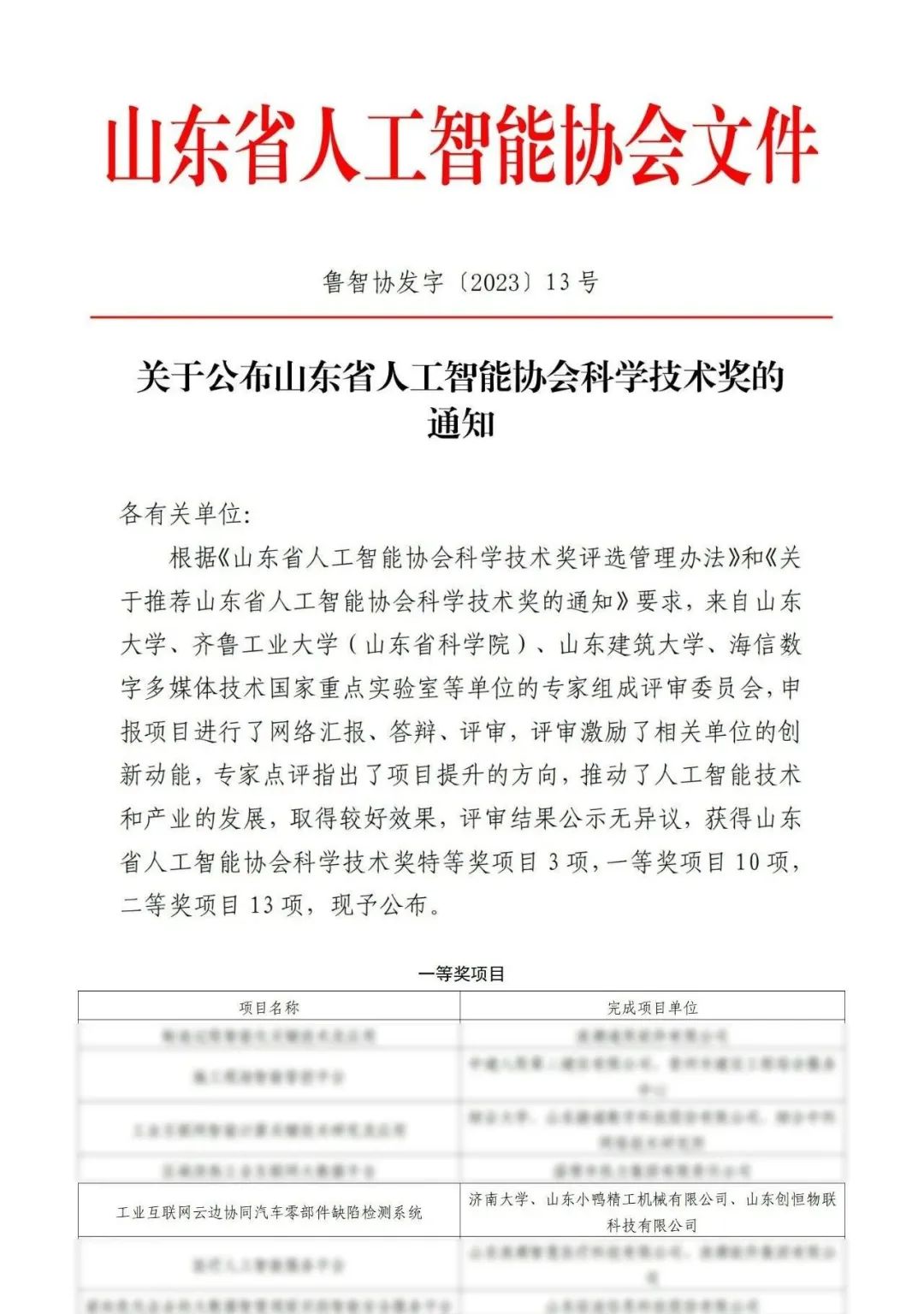 小鸭精工荣获山东省人工智能科学技术一等奖