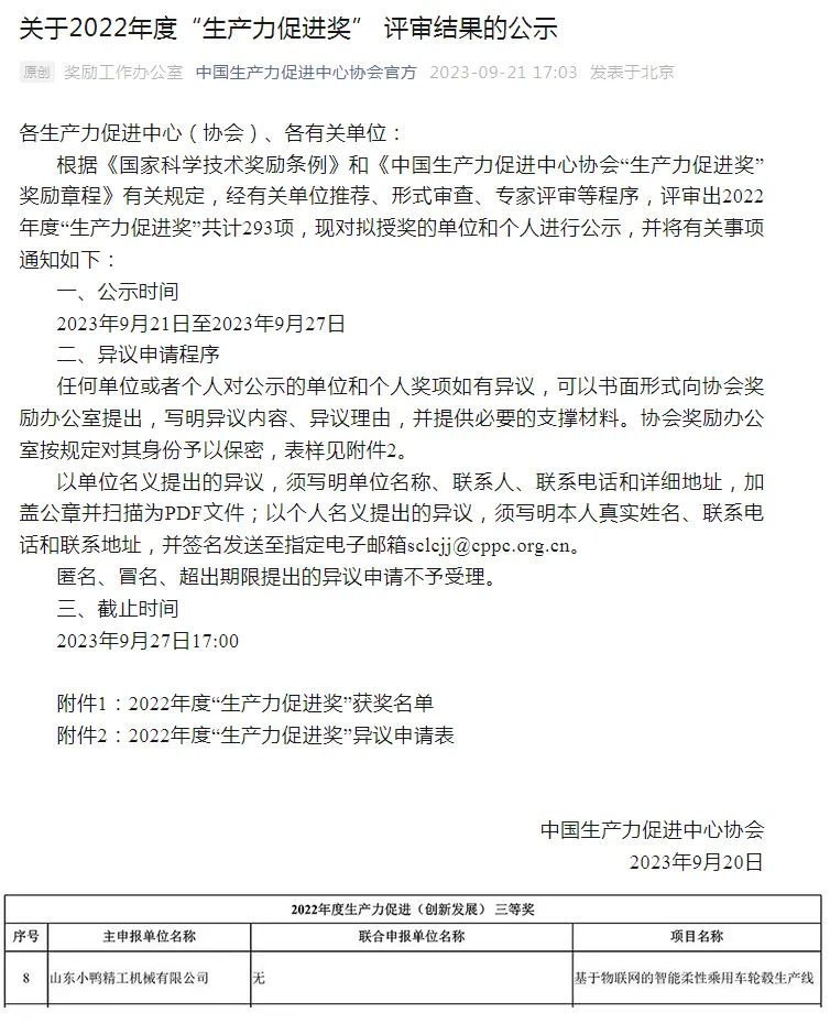 小鸭精工基于物联网的智能柔性乘用车轮毂生产线凭借着传感技术的应用和数据分析处理的能力荣获中国生产力促进中心协会生产力促进奖三等奖。该项目是国际首条应用深度学习的视觉目标识别、激光扫描技术、六轴机器人与3D工业相机集成、物联网在生产线的嵌入式应用等先进智能手段的自动化轮毂生产线,先后获国家发明专利2项,实用新型专利7项,软件著作权6项。
