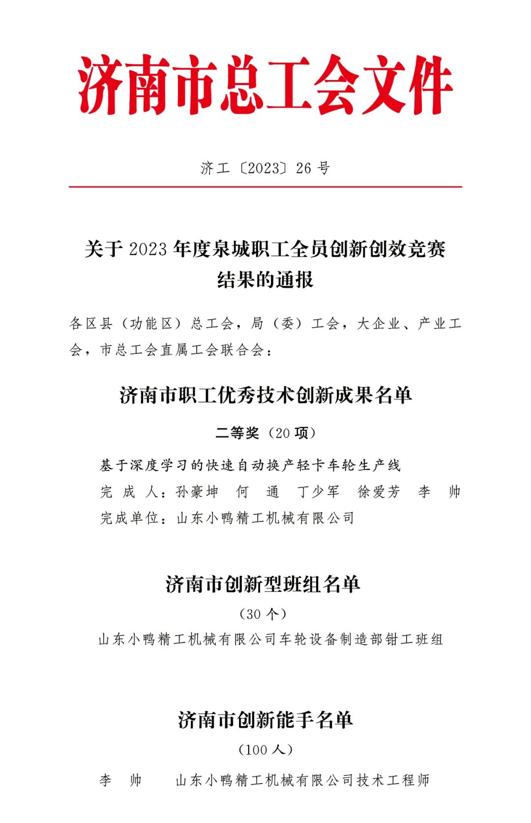 11月29日,济南市总工会开展的2023年度泉城职工全员创新创效竞赛中,小鸭精工基于深度学习的快速自动换产轻卡车轮生产线获得“济南市职工优秀技术创新成果”二等奖、小鸭精工车轮设备制造部钳工班组评为“济南市创新性班组”称号、小鸭精工技术工程师李帅被评为“济南市创新能手”。