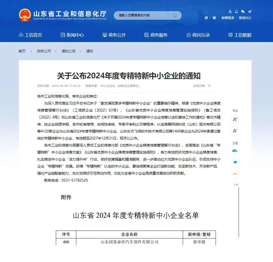 专精特新是特指具有“专业化、精细化、特色化、新颖化”特征的企业。在山东省2024年度通过复核的专精特新中小企业中,小鸭精工车桥生产基地(国基泰祥厂区)名列其中。