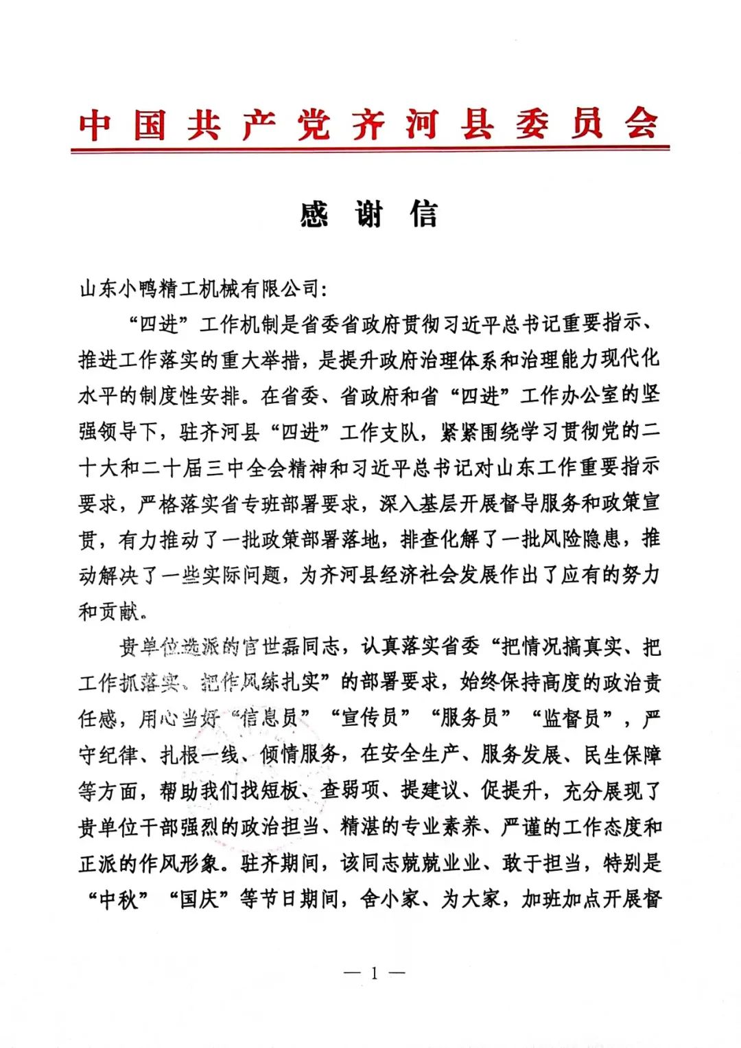 自5月4号开始,小鸭精工选派干部骨干宫世磊同志到驻齐河县“四进”工作支队报道,开展为期6个月的省“四进”工作。工作期间,宫世磊同志认真落实省委“把情况搞真实、把工作抓落实、把作风练扎实”的部署要求,始终保持高度的政治责任感,用心当好“信息员”“宣传员”“服务员”“监督员”,严守纪律、扎根一线,倾情服务,在安全生产、服务发展、民生保障等方面,帮助齐河县“四进”工作支队找短板、查弱项、提建议、促提升,充分展现了小鸭精工人强烈的政治担当、精湛的专业素养、严谨的工作态度和正派的作风形象。为此,齐河县“四进”工作支队特写感谢信一封,感谢公司对“省四进”工作的大力支持,感谢官世磊同志的辛勤付出!
